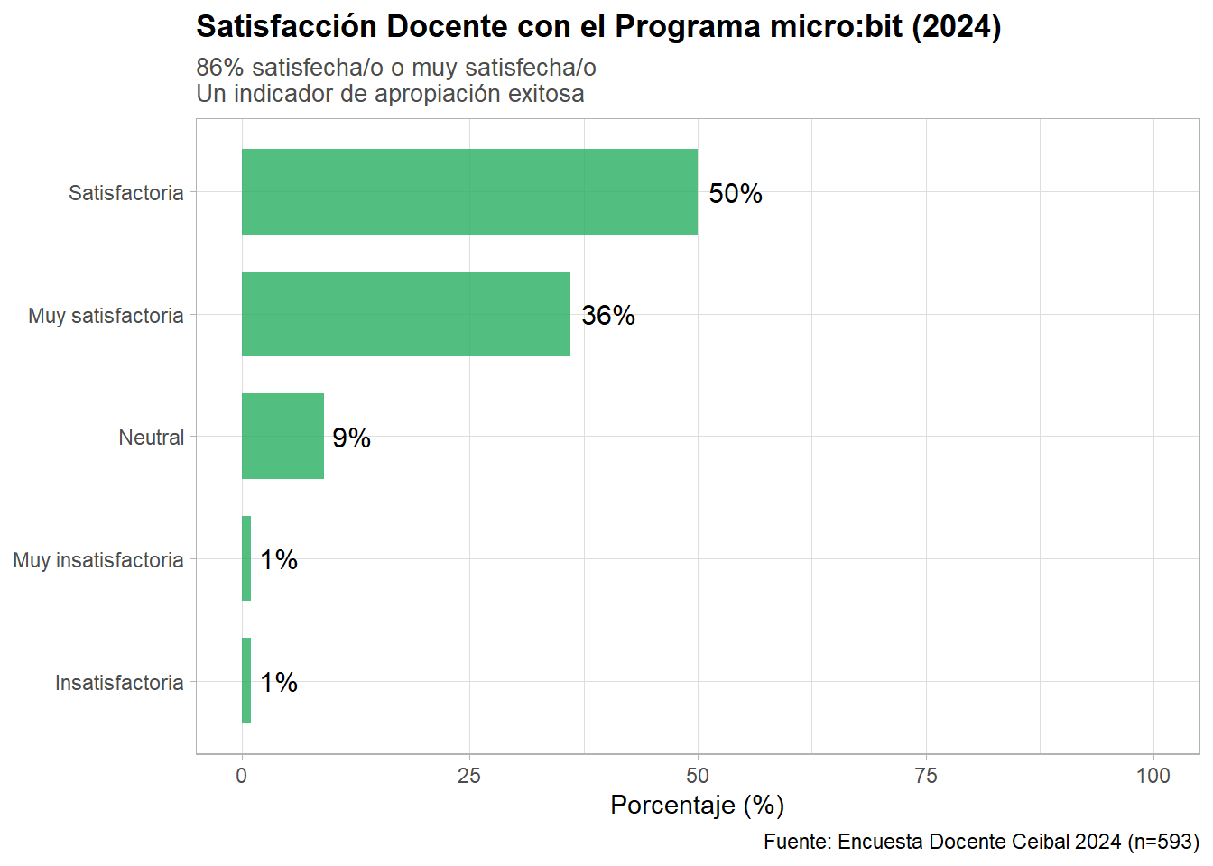 La satisfacción del 86% constituye un gran logro, incluso desde una perspectiva internacional. La Raspberry Pi Foundation reporta tasas similares (82-88%) en sistemas educativos de referencia como los de Reino Unido y Singapur, que llevan más años de implementación. Que Uruguay alcance estos niveles en su fase de consolidación refleja la solidez del diseño pedagógico y el acompañamiento territorial. Además, el 96% de la comunidad docente recomendaría el programa a colegas, lo que valida que la experiencia genera un valor percibido genuino, que trasciende el mero cumplimiento formal.