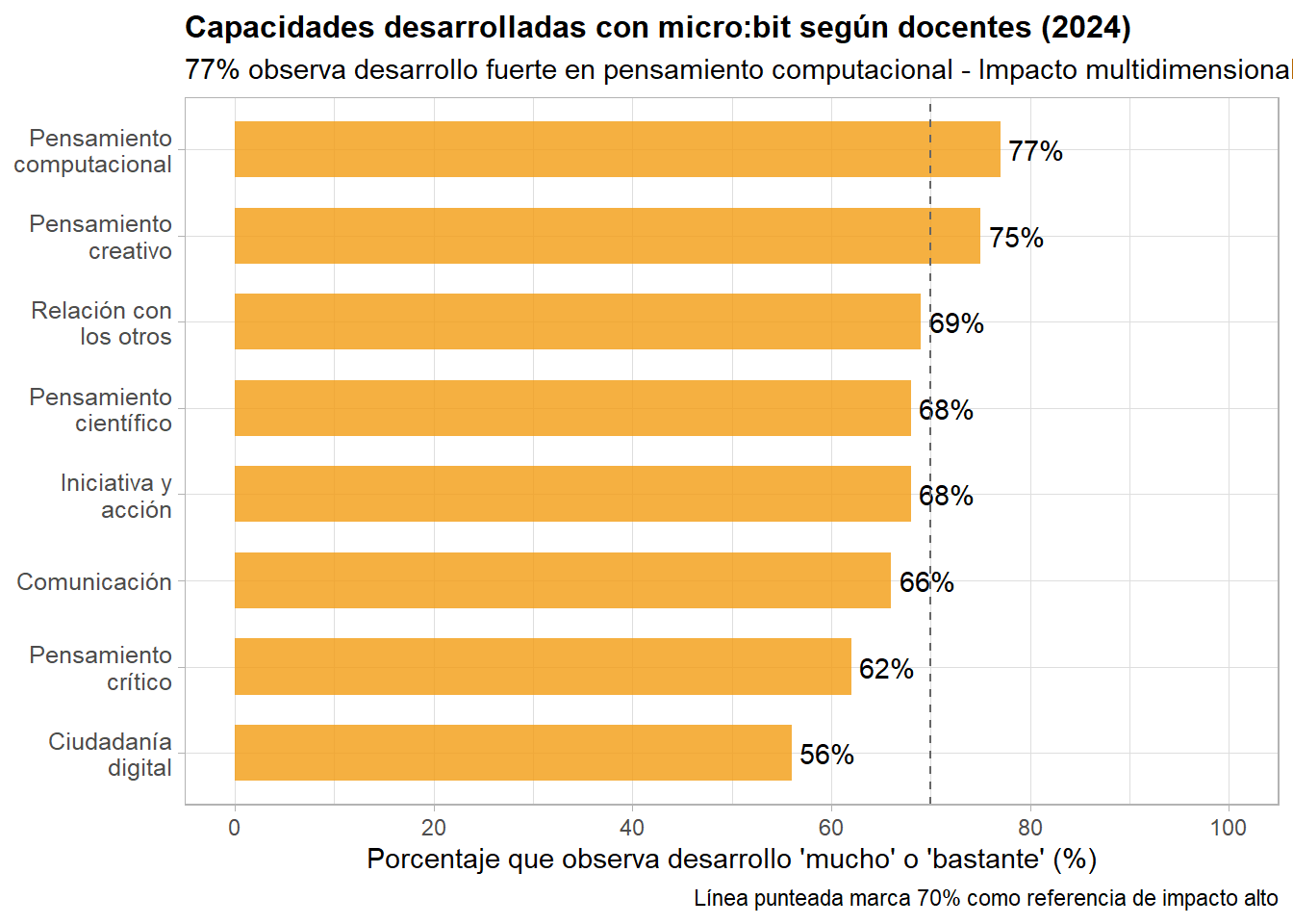 El 77% que observa desarrollo fuerte en pensamiento computacional está en línea con los 72-80% reportados en evaluaciones del BBC micro:bit Educational Foundation en Reino Unido tras 3-5 años de implementación. Alcanzar estos niveles en la fase de consolidación habla de la efectividad de la estrategia pedagógica uruguaya.