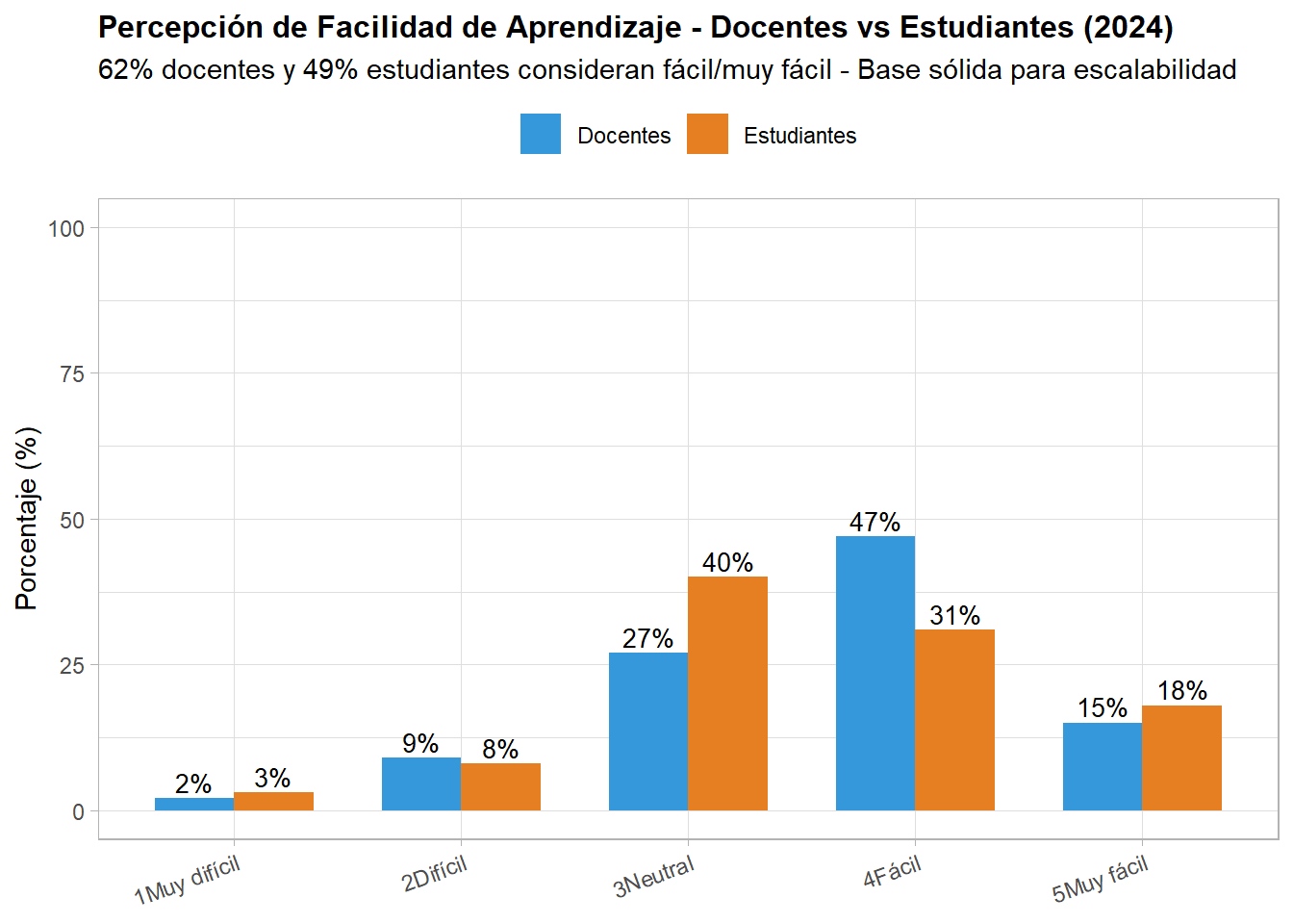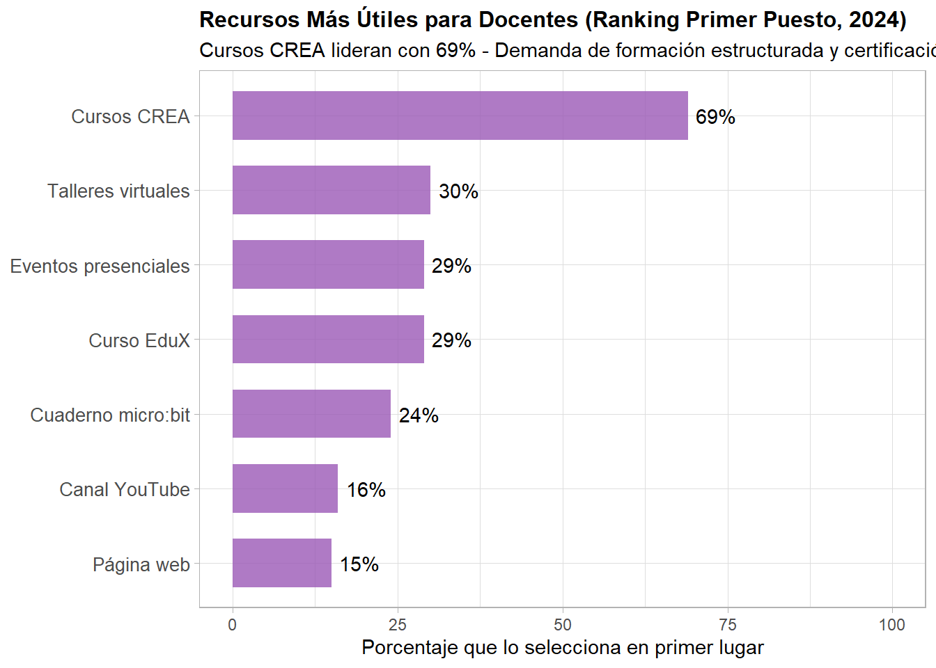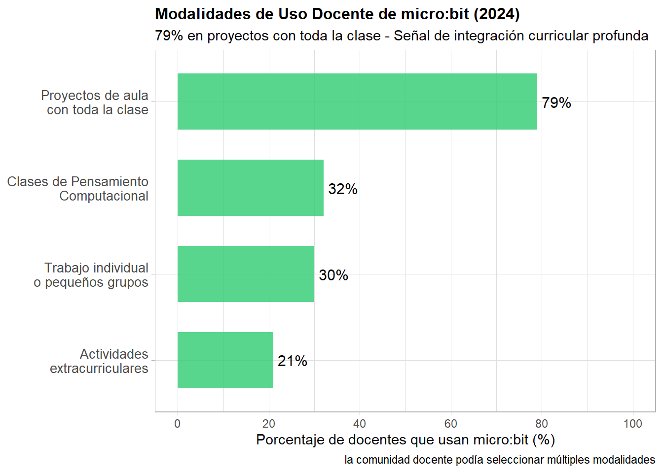 Que el 79% de la comunidad docente use micro:bit en proyectos con toda la clase es un indicador sólido de apropiación pedagógica. Este no es uso periférico (laboratorio opcional) sino integración curricular significativa, que replica modelos exitosos internacionales como el Digital Maker Programme de Singapur, donde el 75% de la comunidad docente reporta uso en clases centrales vs actividades electivas.