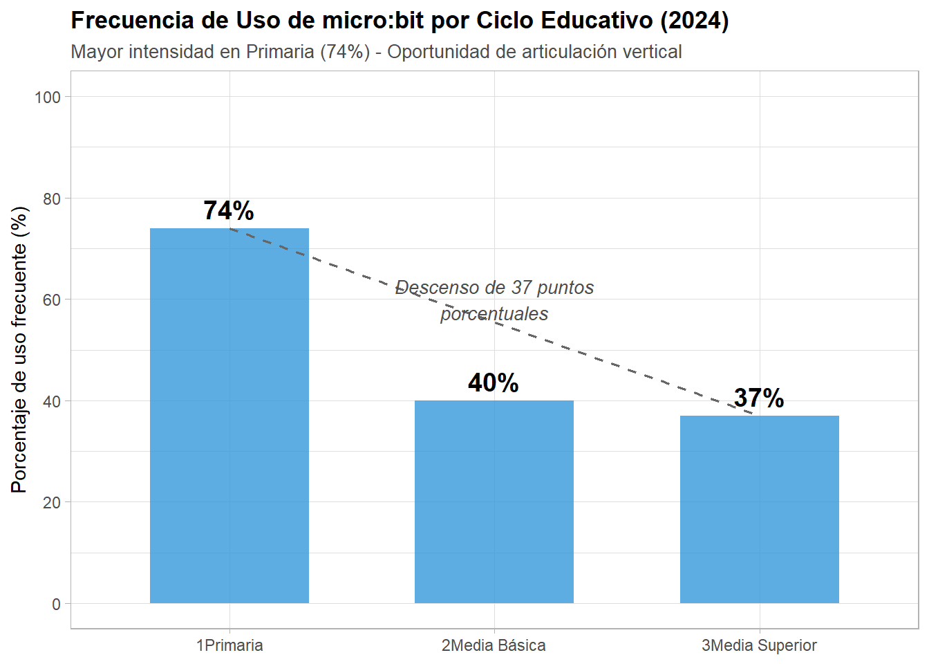La diferencia de uso entre Primaria (74%) y Media Superior (37%) no es una falla sino una señal de diferenciación pedagógica natural. La Raspberry Pi Foundation observa patrones similares: en Reino Unido, el uso intensivo en Key Stage 2 (primaria) es del 68% versus 42% en Key Stage 4 (secundaria superior), donde la presión de exámenes nacionales compite por tiempo curricular.