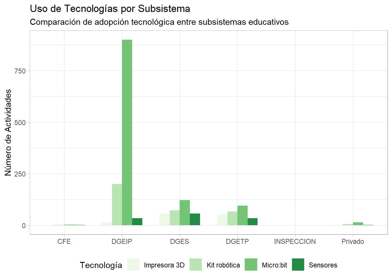 Se observa una interesante complementariedad tecnológica entre subsistemas, donde cada uno desarrolla su propio perfil de adopción. Esta diversificación sugiere que las tecnologías se están integrando de manera orgánica según las necesidades particulares de cada contexto educativo.