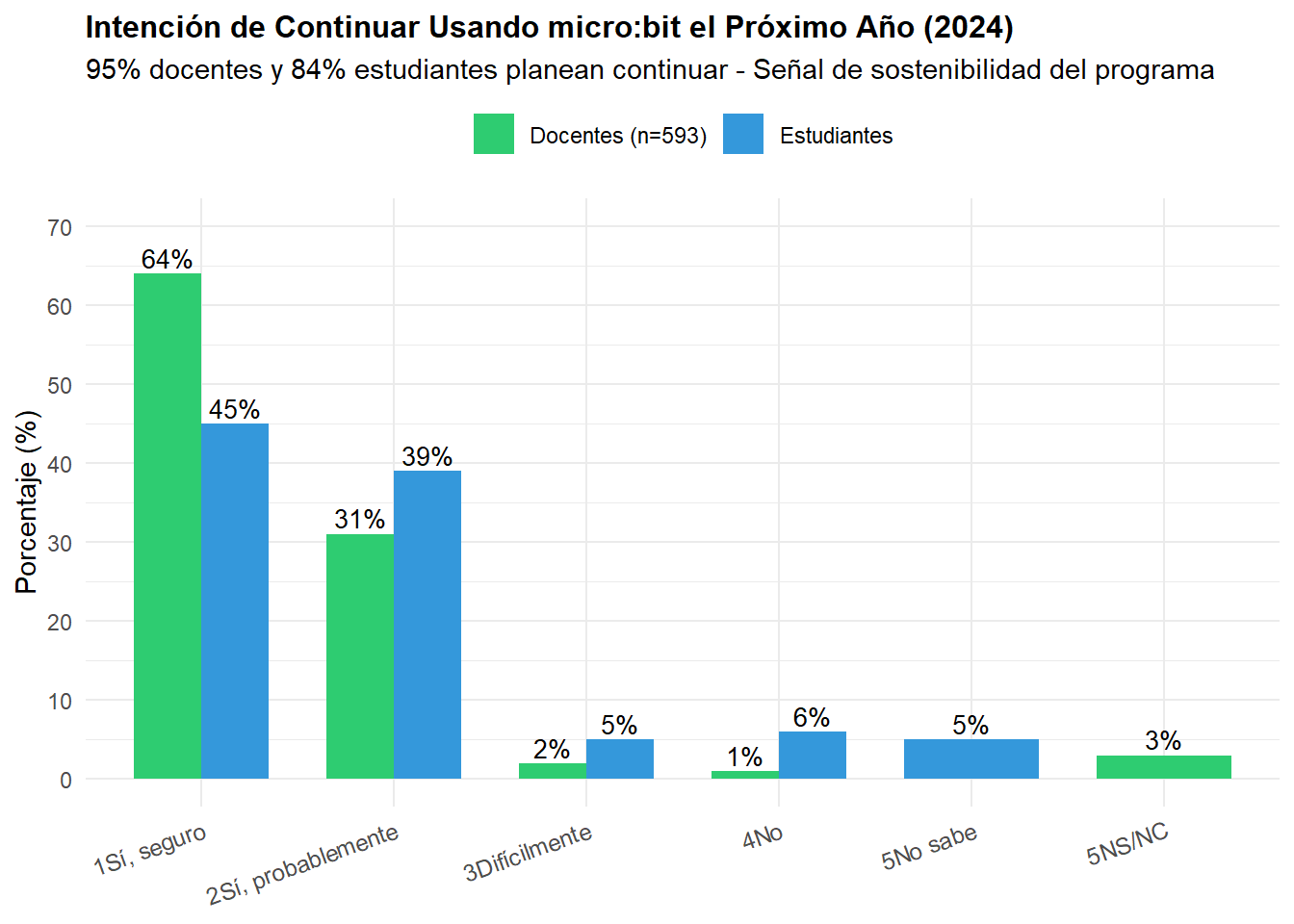 Hay entusiasmo docente real: Los reportes cualitativos son consistentes. Docentes que usan micro:bit valoran la herramienta, estudiantes se enganchan.